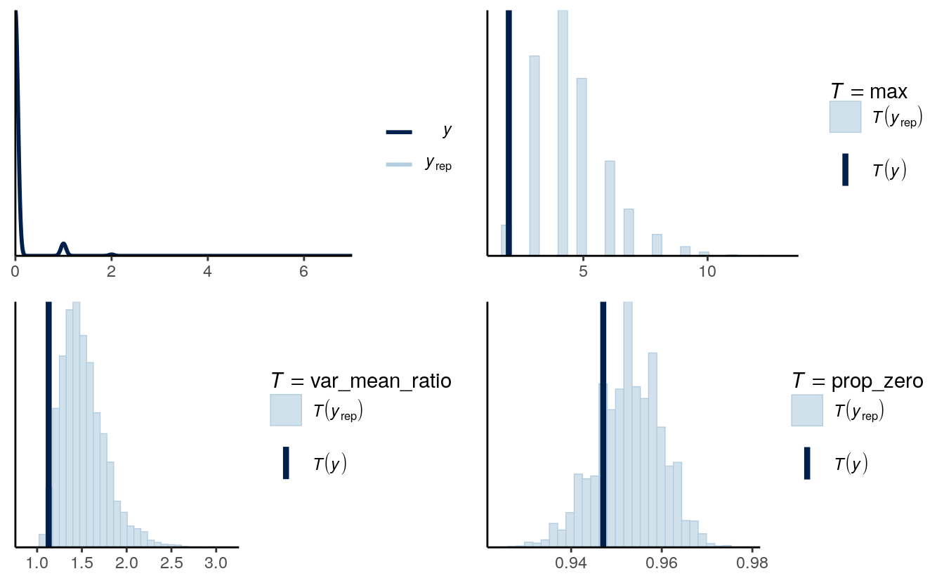 One should look at the posterior predictive graphical check, marginal model plots, proportion of zeros, maximum values, and the standardized residuals against the fitted values. From the plots below, it is obvious that the Poisson model does not fit the data, as the variability of the data is much larger than what can be predicted by the Poisson model, with excessive zeros. The predictive intervals failed to cover a large number of data.