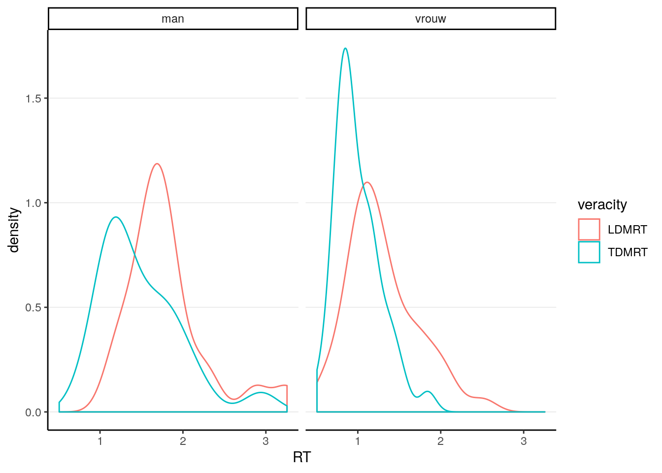 Instead of looking at lie-truth difference across languages, we will start off by comparing difference in RT for telling a lie in Dutch between males (man) and females (vrouw), as the model is easier to understand for independent sample comparisons, and the model can be applied generally for between-subject experimental designs.