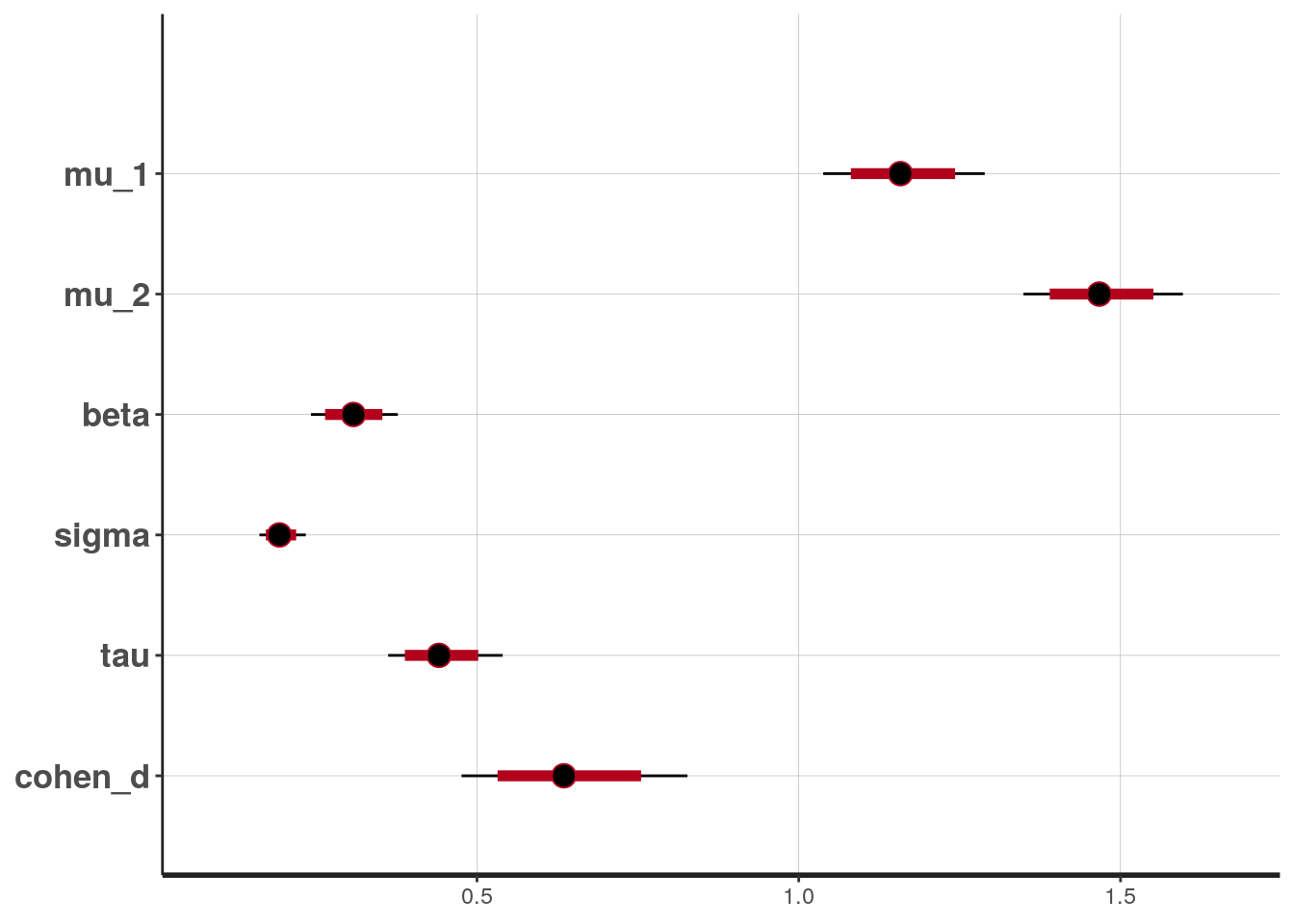 broom::tidy(m4, pars = c("mu_1", "mu_2", "beta", "sigma", "tau", "cohen_d"),