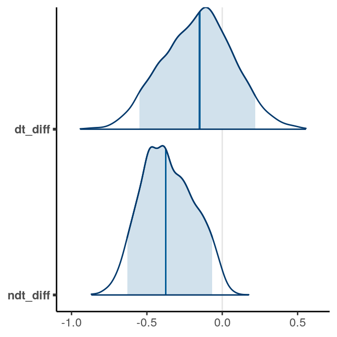 \[\begin{align} \texttt{LDMRT}_{ij} & \sim \mathcal{N}^+(\mu_j, \sigma) \\ \mu_j & = \begin{cases} \mu_1, & j = 1 \\ \mu_1 + \beta, & j = 2 \end{cases} \\ \mu_1 & \sim \mathcal{N}^+(0.5, 2.5) \\ \beta & \sim \mathcal{N}(0, 2.5) \\ \sigma & \sim t^+(4, 0, 1) \end{align}\]