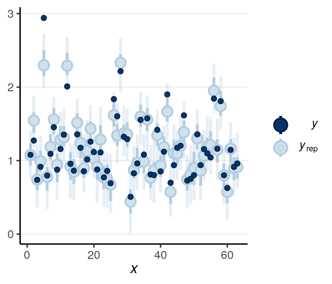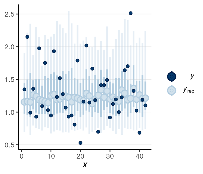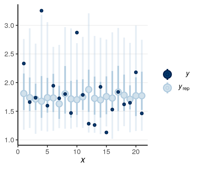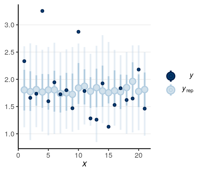 From above, as the estimate of \(\nu\) was quite small, it was pretty clear that there are outliers that need to be handled (and was handled somewhat by the robust Student’s \(t\) model). Let’s look at some posterior predictive checks:
