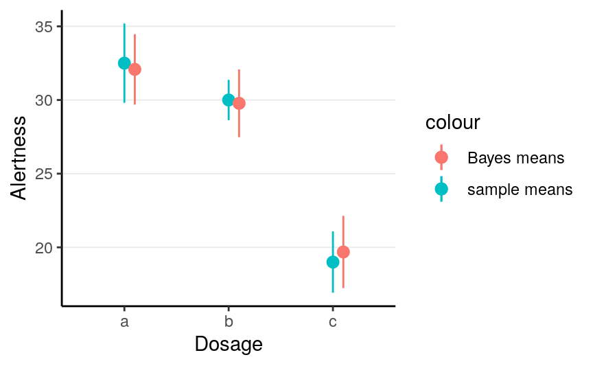 Note that in the above model, the Bayes estimates of the group means are different from the sample group means, as shown in the following graph: