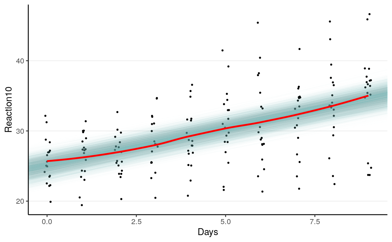 m5 <- brm(bf(Reaction10 ~ Days + (Days |c| Subject),