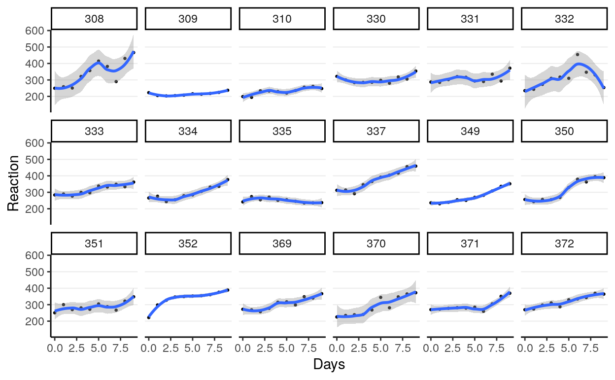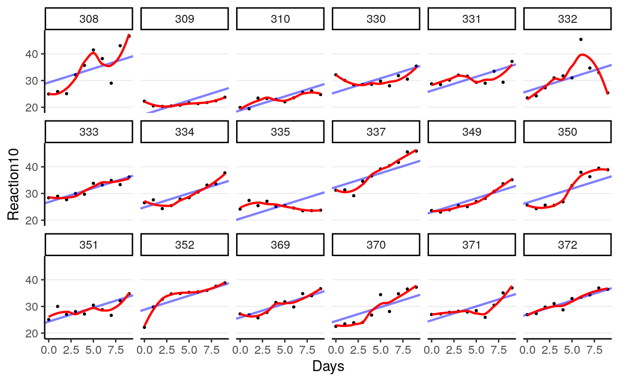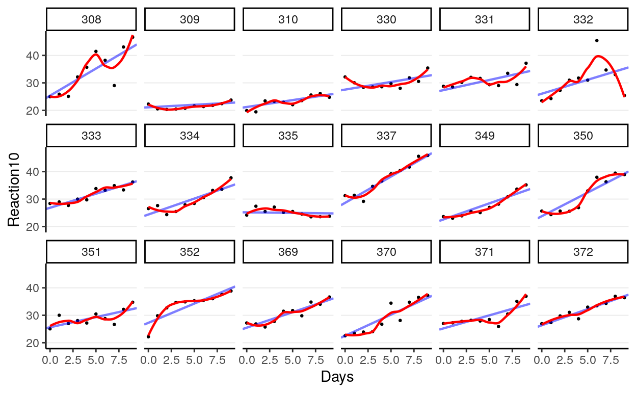 | Cor(Intercept,Days): Subject | 0.06 | -0.00 | ||