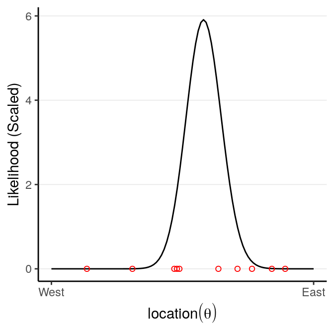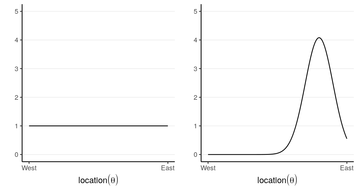 Consider a highly simplified scenario of locating a missing plane in the sea. Assume that we know the plane, before missing, happened to be flying on the same latitude, heading west across the Pacific, so we only need to find the longitude of it. We want to go out to collect debris (data) so that we can narrow the location (\(\theta\)) of the plane down.
