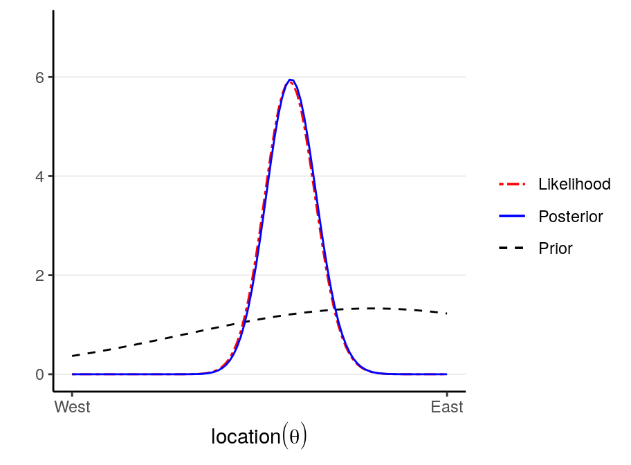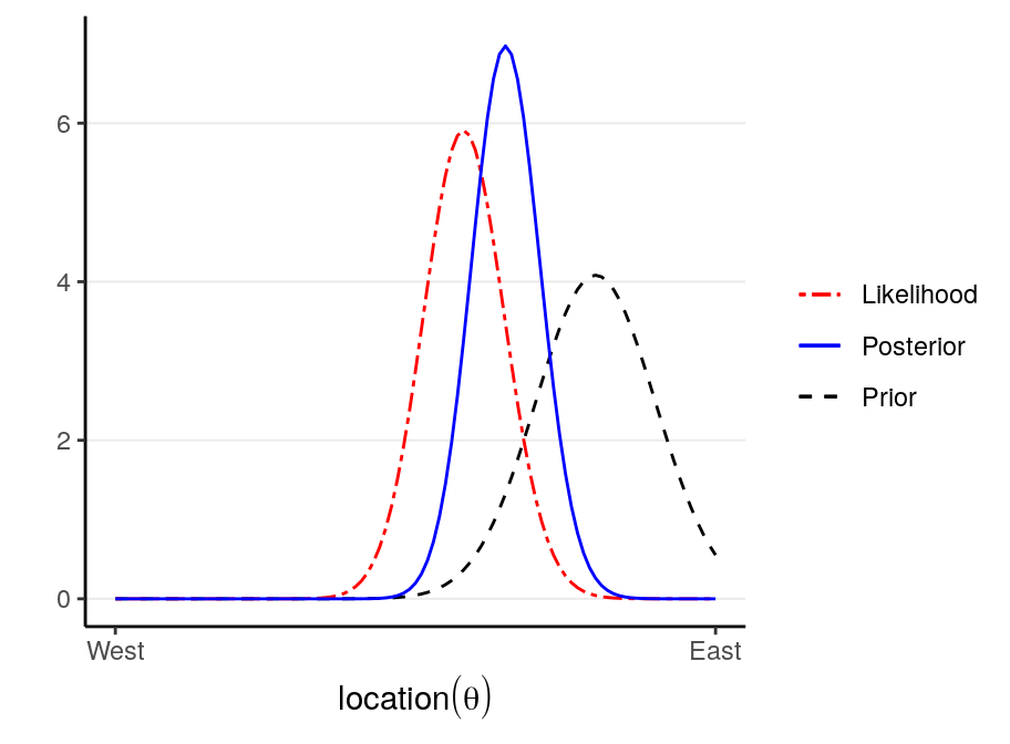 So we can simply multiply the prior probabilities and the likelihood to get the posterior probability for every location. A rescaling step is needed to make sure that the area under the curve will be 1, which is usually performed by the software.