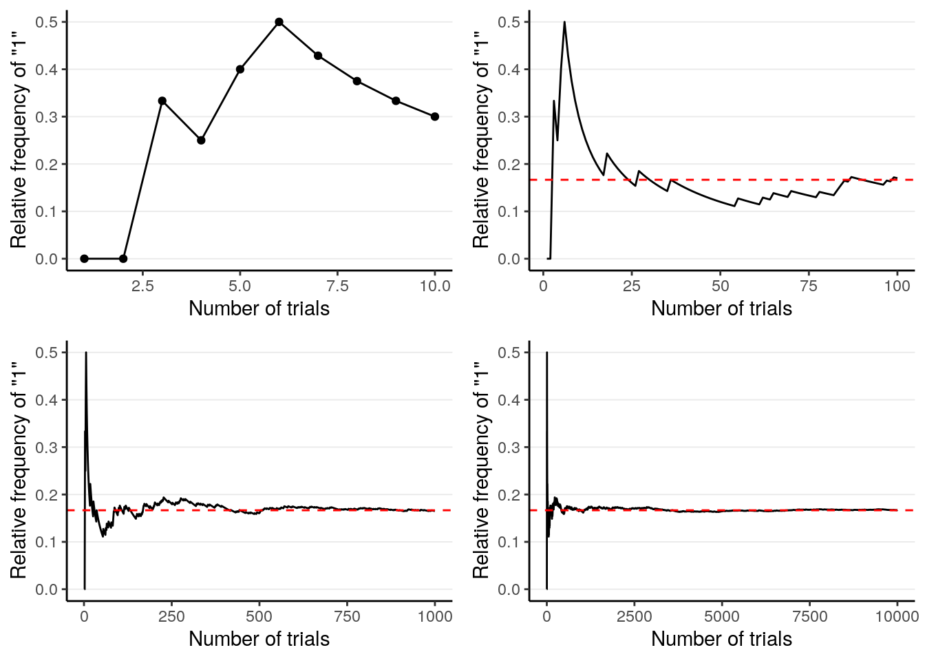 As you can see, with more trials, the relative frequency approaches 1 / 6. It’s the reason why in introductory statistics, many of the concepts require you to think in terms of repeated sampling (e.g., sampling distribution, \(p\)-values, standard errors, confidence intervals), because probability in this framework is only possible when the outcome can be repeated. It’s also the reason why we don’t talk about something like:
