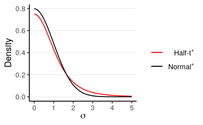 As you can see, there is more density towards zero, but the tail is still quite heavy (as compared to a normal distribution), as you can see by comparing it to the tail of a half-normal distribution (which just means it starts from 0 instead of \(-\infty\)). This will avoid some extremely large values, but also not be overly restrictive in case \(\sigma\) is extremely large.
