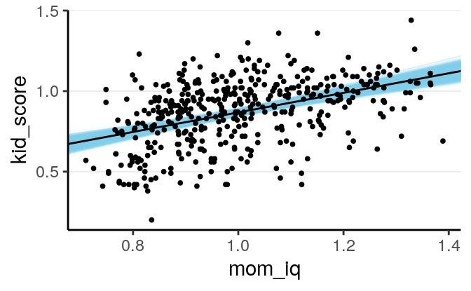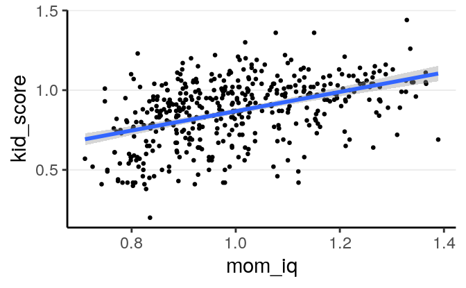 \[\mu_i = \beta_0 + \beta_1 \texttt{mom_iq}_i\]