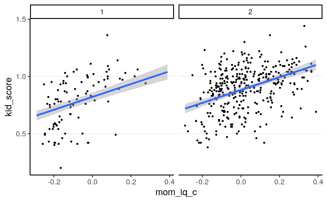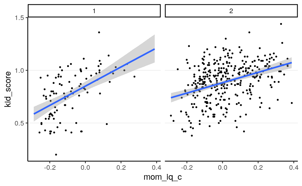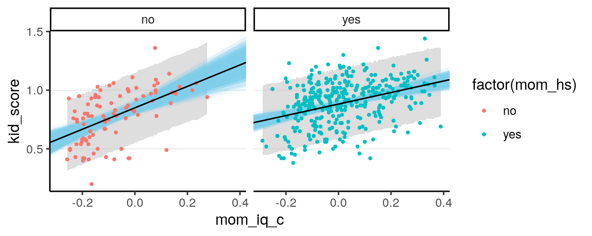 \[\begin{align*} \mathrm{E}(\texttt{kid_score} \mid \texttt{mom_iq_c}, \texttt{mom_hs} = 1) = (\beta_0 + \beta_2) + (\beta_1 + \beta_3)(\texttt{mom_iq_c}) = \beta_0^* + \beta_1^*(\texttt{mom_iq_c}) \end{align*}\]