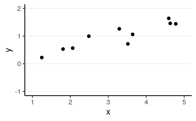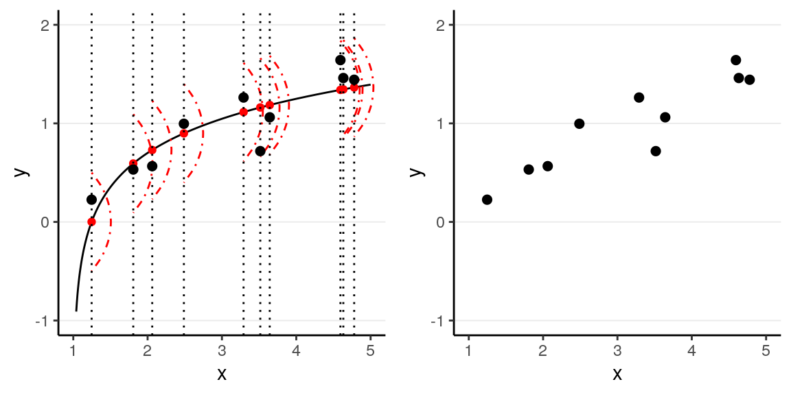We can write the systematic part as: \[\mathrm{E}(Y \mid X) = f(X; \beta_1, \beta_2, \ldots), \] where \(\beta_1\), \(\beta_2\), \(\ldots\) are the parameters for some arbitrary function \(f(\cdot)\). The random part is about \(P(Y \mid X)\) which can take some arbitrary form of distributions. The problem is that in reality, even if such a model holds, we do not know what \(f(\cdot)\) and the true distribution of \(Y \mid X\) are, as we are only presented with data like those illustrated in the graph on the right above.