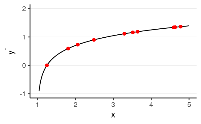 As you can see, all the red dots fall exactly on the curve in the graph above, meaning that as long as one knows the \(X\) value, one can predict the \(Y\) value with 100% accuracy. We can thus write \(Y^* = f(X)\) (where \(Y^*\) is the systematic component of \(Y\)).