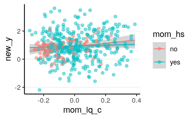 mom_hs = factor(mom_hs, labels = c("no", "yes")))m4 <- brm(kid_score ~ mom_iq_c * mom_hs, data = kidiq100,