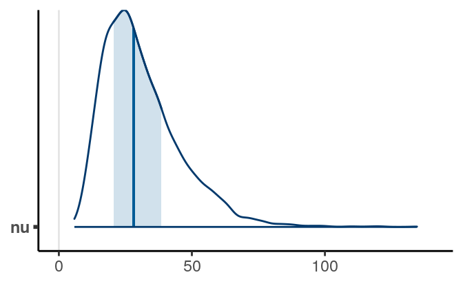 )In brms, the default prior is \(\nu \sim \mathrm{Gamma}(2, 0.1)\), with a lower bound of 1: