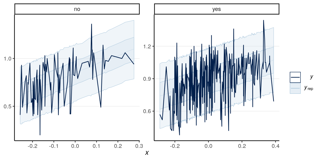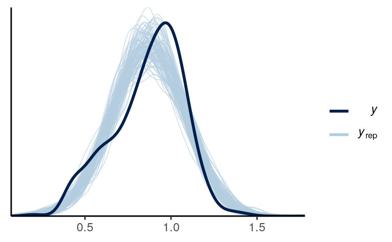 Now let’s review some tools for regression diagnostics for Bayesian regression. There are hundreds of plots available that I will not cover here, and you can treat what is discussed in this note as a minimal requirement for regression diagnostics. The first one is about a correct specification of the model, which can be partly assessed with posterior predictive check.