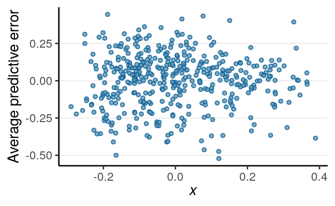 For regression analyses one can learn a lot about model fit from the residuals, which is \(y_i - \tilde{y}_i | \theta\), i.e., subtracting the observed \(y_i\) values by the posterior predictions. Because in Bayesian there are not just one prediction, but a whole predictive distribution, one also has an entire posterior distribution for each residual. Below is a check of the average residual \(Y\) (i.e., \(Y\) - \(\hat Y\)) and the true value of \(Y\). If the model fit the data well, the points should be scattered with no specific pattern, like the graph below: