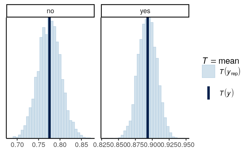 pp_check(m4, type = "stat_grouped", stat = "mean", group = "mom_hs")># Using all posterior samples for ppc type 'stat_grouped' by default.