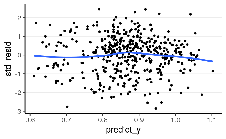 All points are within the -3 to 3 range, so no big issues with outliers. Also, the errors of the residuals have similar variance/spread, so the equal variance assumption is fine. In addition, if there are any systematic pattern between the residuals and the predicted \(y\), or any systematic pattern between the residuals and any of the predictors, the model can be misspecified and some additional predictors or nonlinear terms should be included.