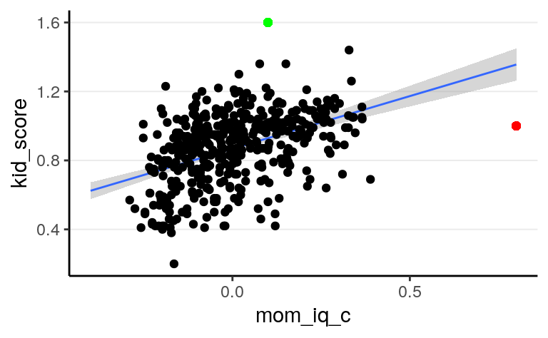 Robustness refers to the degree to which the results of statistical analyses change with assumption violations; a robust method would give similar (consistent) results when certain assumption is violated (to a certain degree). As you already know, there are several assumptions in a linear model; however, unfortunately, often when one says robust methods, it is not always the case that they specify which assumption violation the methods. More commonly than not, a robust method is robust to outliers/influential observations, where outliers are data points that are unusually distant from the majority of the data. For example, both the red and the green dots will be considered outliers in the graph below, as both are away from the majority of the data. The red point will be considered an influential observation because it can have a relatively large influence on the regression line.