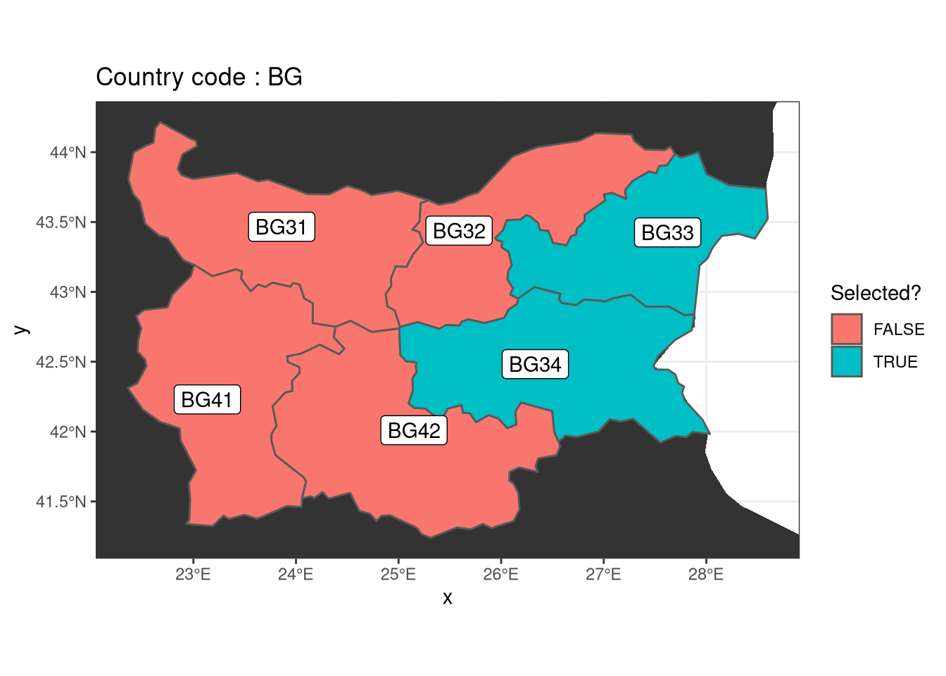 For countries not covered by EUMOFA, we generated a comparable database of landings based on the “EUROSTAT landings” dataset. We first aggregated the species resolution in EUROSTAT data from FAO species codes to the “Main commercial species” (MCS) groupings used by EUMOFA, based on correlation keys provided by EUMOFA, to ensure comparability between these data sets. We then associated these landings with the coastal NUTS2 regions in each country. In some cases (e.g. Iceland, Malta, Cyprus) there was only one NUTS2 region: however in other cases (notably Bulgaria) we generated new “regions” based on the union of multiple coastal NUTS2 regions. The new NUTS2 regions selected in each of these cases can be seen below: