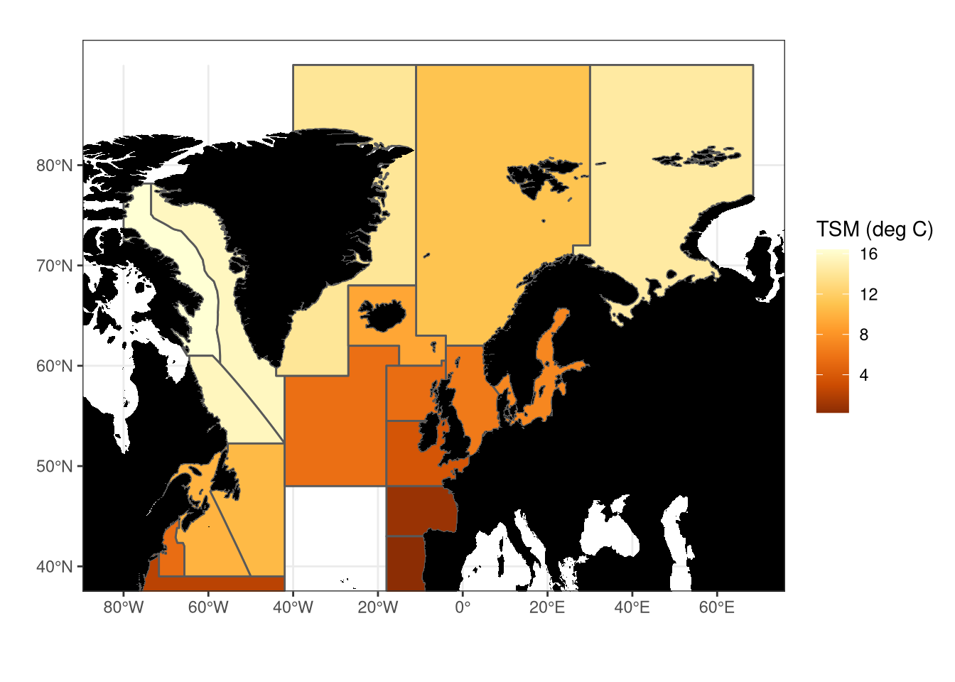 Aquamaps provides the environmental data that underlies its models. We use this data for all analyses to ensure consistency between the thermal envelope parameters and the spatial distribution of temperature used to calculate TSM. We use the habitat distribution from Aquamaps to filter this environmental data to regions where the species of interest is expected to occur. For Atlantic cod, this looks like so: