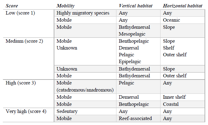 TODO: * Habitat specificity traits. Three traits were combined and scored (see table) + a low score infers low habitat specificity or good adaptive capacity +a high habitat specificity score indicates a species with low adaptive capacity.