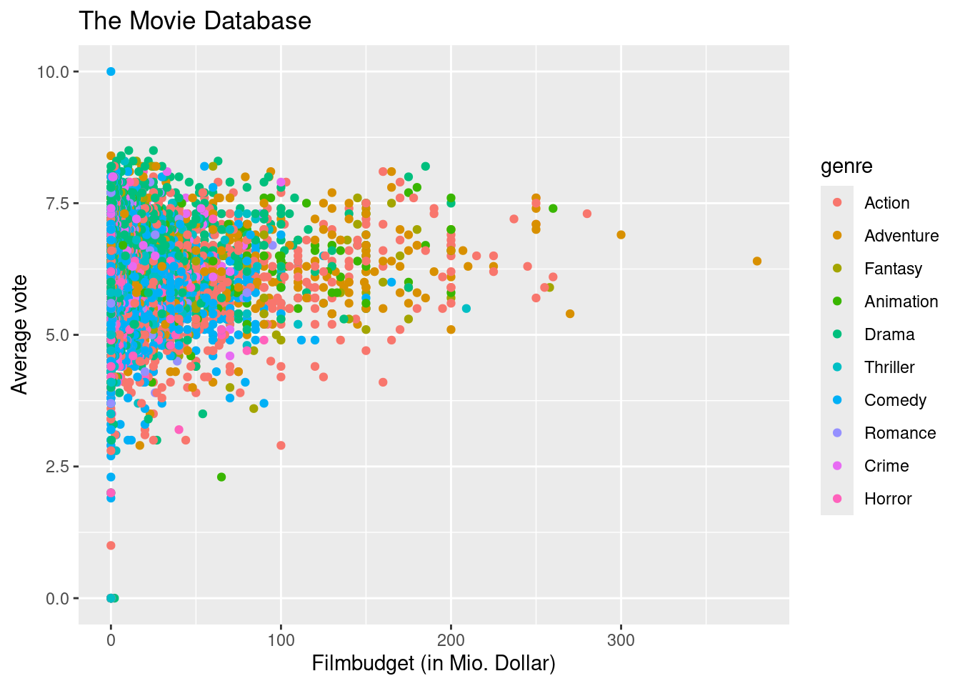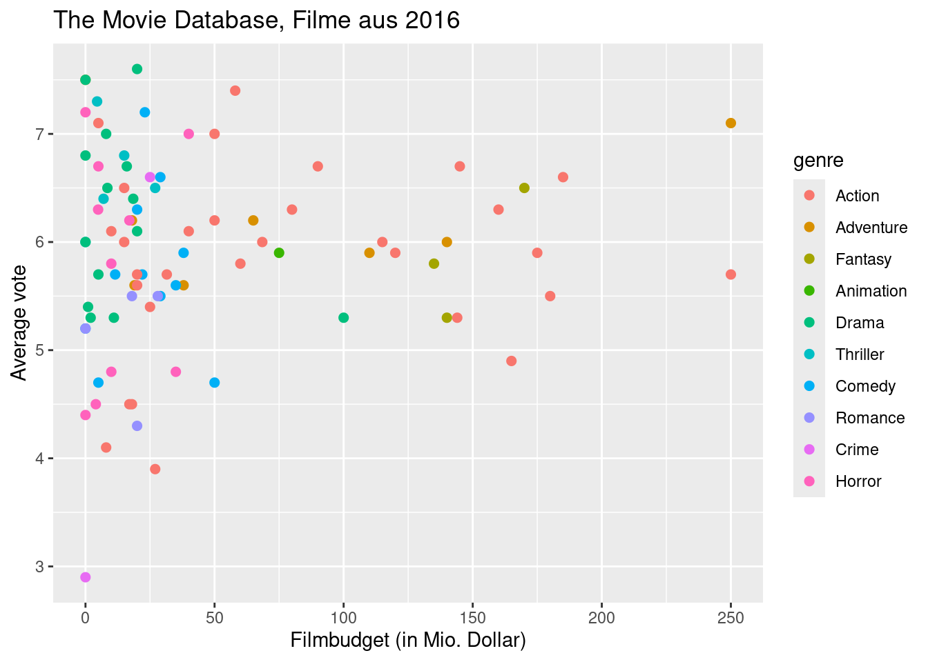 Sofern man nicht an einer Farbsehschwäche leidet, erkennt man an dieser Grafik schnell, dass Action-Filme besonders teuer sind. Sie sollten bei der Erstellung einer farbigen Grafik jedoch bedenken, dass vor allem die Rot-Grün-Sehschwäche recht weit verbreitet ist. Informationen, die durch rote und grüne Farbe symbolisiert wird, sind für Menschen mit einer Rot-Grün-Schwäche nicht erkennbar. Es gibt in R die Möglichkeit, inklusive Farbpaletten zu wählen, die auch dann unterscheidbar sind, wenn eine Farbsehschwäche vorliegt. Hinweise und Tipps zur Farbgestaltung findet man auf vielen Internetseiten (z.B. mit den Suchbegriffe ggplot und colorblind). Wir gehen in diesem Kurs jedoch nicht weiter darauf ein.