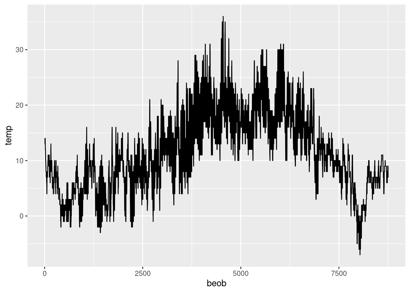 rad <- read.csv("../data/fahrrad2023.csv")Der Dataframe rad enthält u.a. die Variable beob. Sie gibt an, in der wie vielten Stunde des Jahres 2023 die Beobachtung gemacht wurde. Die Variable temp enthält die Temperatur für jede Stunde des Jahres. Der Temperaturverlauf über das ganze Jahr kann durch eine Linie dargestellt werden.