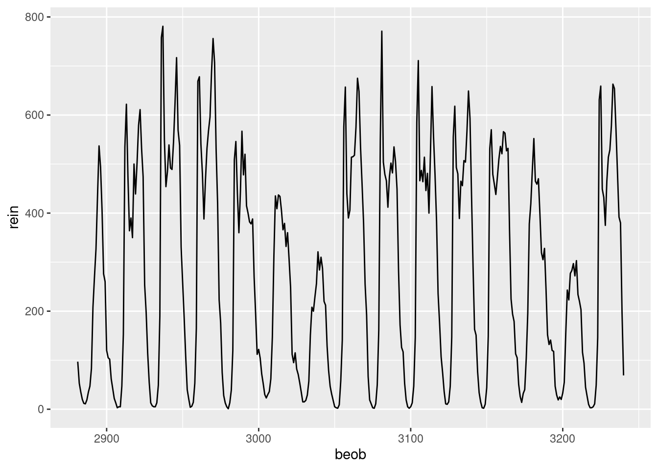 Zur Erklärung: Das erste Argument ist wieder der Dataframe rad, der die Variablen beinhaltet. Anschließend werden die Aesthetics aufgeführt, hier die Variable beob (also die Zeit) auf der x-Achse und die Variable temp auf der y-Achse. Durch das Pluszeichen wird klar, dass der Befehl noch nicht zu Ende ist. In der zweiten Zeile wird das Linien-Geom ausgewählt. Nun werden alle Datenpunkte in der Reihenfolge, in der sie vorliegen, mit einer Linie verbunden.