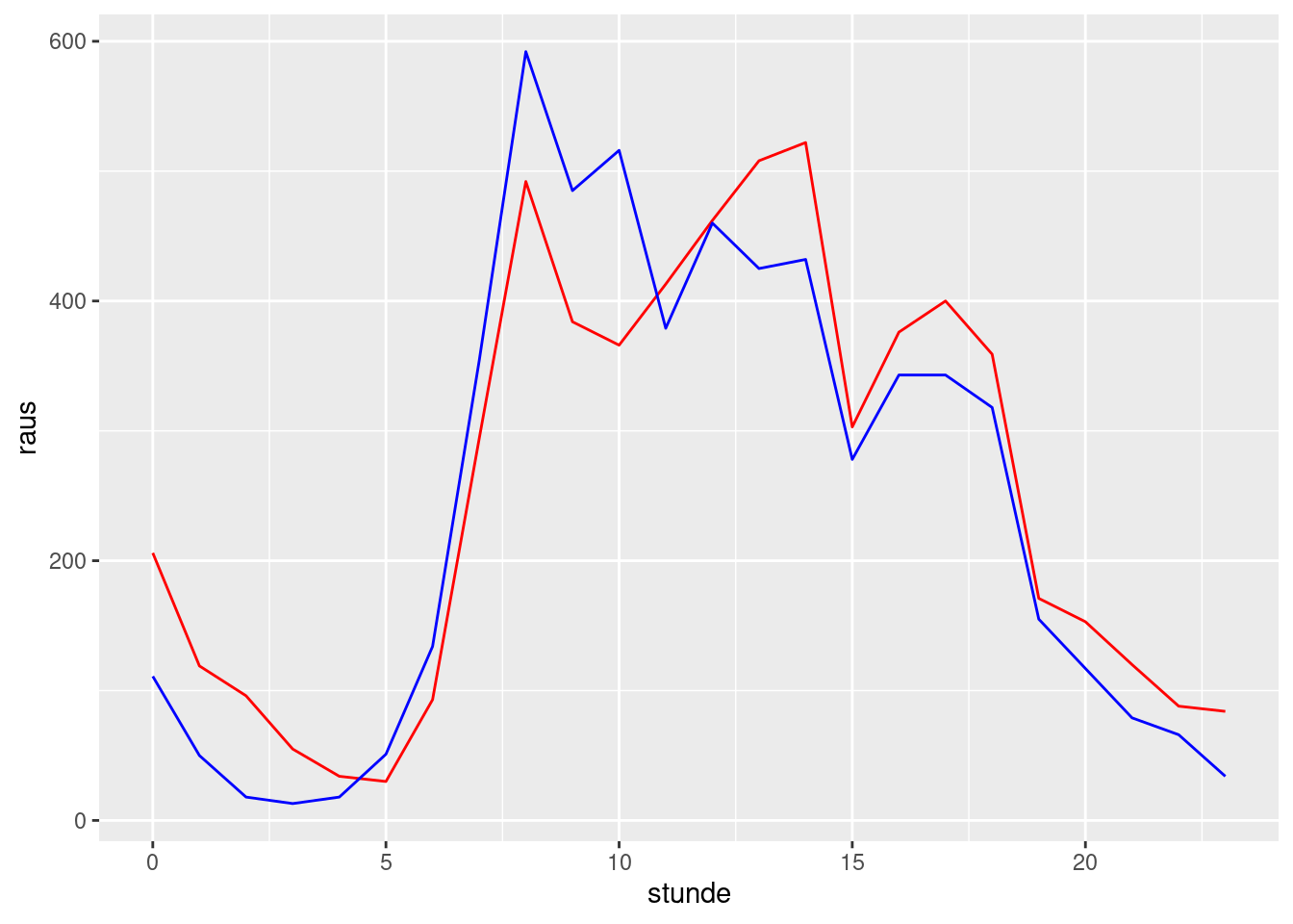Es ist auch möglich, mehrere Linien in einer Grafik zu zeigen. Dazu werden als Argument zu einem Geom neue Aesthetics angegeben. Die folgende Abbildung zeigt in rot die Zahl der Fahrräder, die am 22.6.2023 stadtauswärts gezählt wurden, und in blau die Zahl der Fahrräder, die stadteinwärts gezählt wurden.