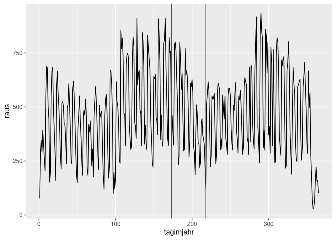 Um grafisch zu untersuchen, ob die Sommerferien einen Einfluss auf die Zahl der Fahrräder haben, werden zwei senkrechte rote Linien in die Abbildung eingefügt, die den Start und das Ende der Sommerferien markieren. Die Sommerferien starten am Tag 173 (der Variable tagimjahr) und enden am Tag 218. Zusätzliche Elemente werden oft als eigene geoms ergänzt. Senkrechte Linien sind geom_vline (vertical line). Das Argument xintercept legt fest, an welcher Stelle die Linie gezeichnet werden soll.