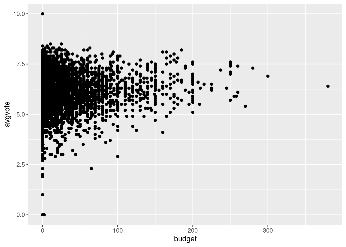 p <- ggplot(tmdb, aes(x=budget, y=avgvote))Die Daten sind im Dataframe tmdb gespeichert. Die beiden Variablen budget und avgvote sollen als Aesthetics (aes) angezeigt werden, und zwar soll budget auf der x-Achse und avgvote auf der y-Achse abgetragen werden (die Angaben x= und y= könnte man auch weglassen, weil es sich um die Standardangaben für ein Streudiagramm handelt). Das von der Funktion ggplot erzeugte Objekt p ist die (noch leere) Grafik. Man kann sie durch print(p) (oder einfach p) anzeigen lassen.