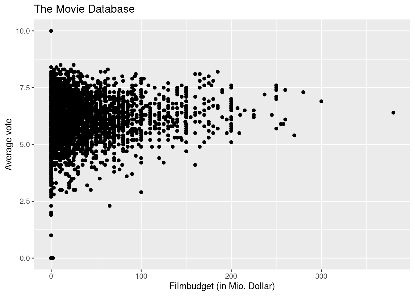 Wir möchten nun aus dem Dataframe tmdb die Variablen budget und avgvote grafisch darstellen. Mit dem folgenden Befehl wird die Grafik vorbereitet: