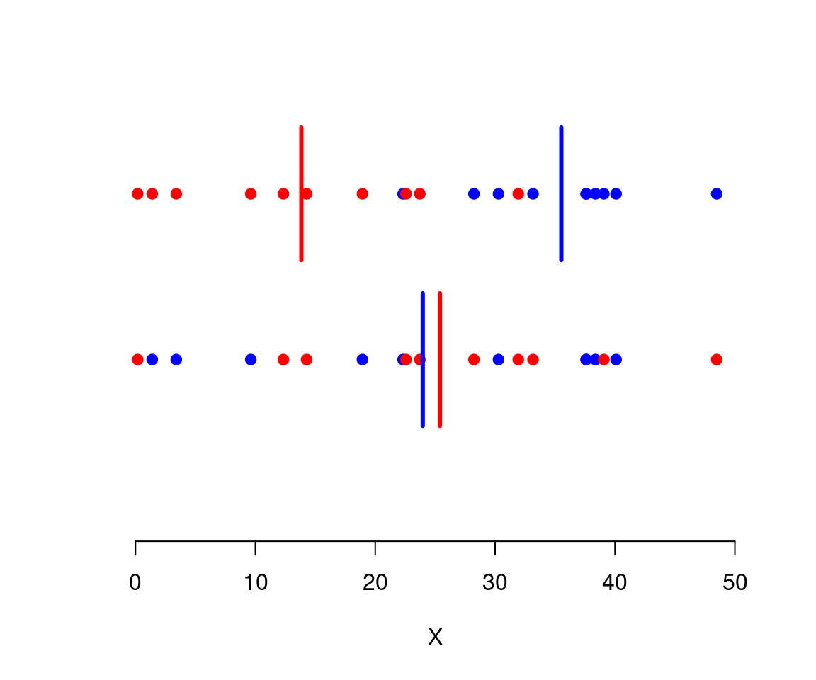 Das lässt sich an einer einfachen Grafik gut erkennen. Die folgenden Punkte zeigen \(n=20\) Werte einer Variablen \(X\). Alle Punkte gehören entweder in die rote oder in die blaue Gruppe. Wir betrachten zwei verschiedene Arten, die Gruppen zu bilden. In beiden Fällen handelt es sich um exakt die gleichen Werte, sie sind nur anders auf die beiden Gruppen verteilt. Bei der oberen Gruppeneinteilung ist die interne Varianz klein (homogene Gruppen), im unteren Fall ist die interne Varianz groß (heterogene Gruppen). Die senkrechten Striche zeigen jeweils die beiden Gruppenmittelwerte.