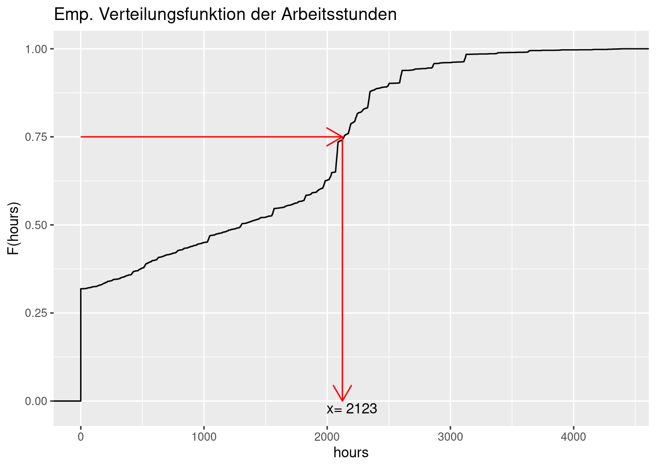 Wir betrachten als Beispiel wieder die empirische Verteilungsfunktion der jährlichen Arbeitsstunden aus dem Dataframe soep. Um auf grafischem Wege das 0.75-Quantil zu ermitteln, ziehen wir eine waagerechte Linie auf der Höhe 0.75 von der y-Achse nach rechts, bis wir auf die Verteilungsfunktion treffen. Dort knicken wir nach unten ab und bestimmen den zugehörigen Wert auf der x-Achse. Dieser Wert ist das 0.75-Quantil. (Die annotate-Befehle im folgenden R-Code dienen dazu, Extras wie die Pfeile in die Grafik einzufügen. Diese Befehle werden hier zwar zur Information gezeigt, sind aber nicht Bestandteil des Moduls.) In diesem Beispiel beträgt das tatsächliche 0.75-Quantil der Arbeitsstunden 2123, aber das lässt sich aus der Grafik natürlich nicht exakt ablesen.