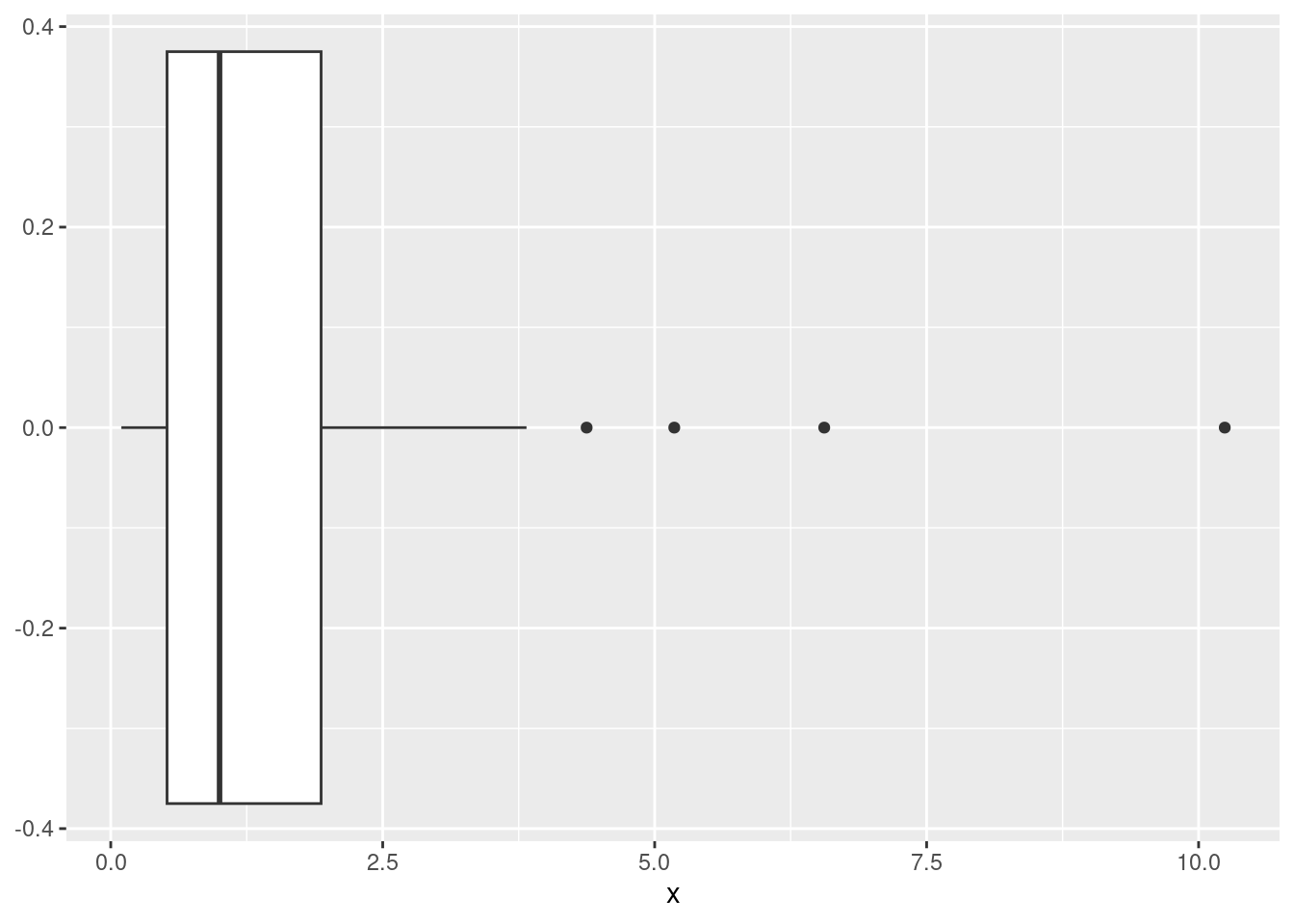 In R kann man mit ggplot Boxplots erzeugen. Wenn nur für eine Verteilung ein Boxplot gezeichnet werden soll, lautet der Befehl