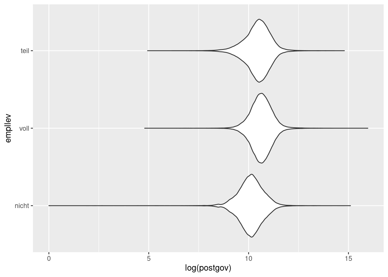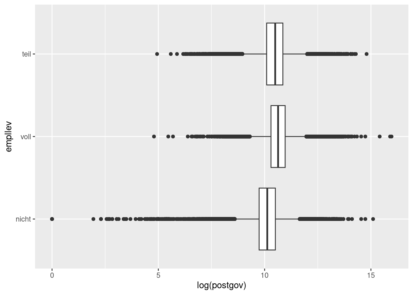 Wir erzeugen die Boxplots des (logarithmierten) Nettoeinkommens log(postgov) für die Personen, die in Teilzeit (“teil”) oder Vollzeit (“voll”) arbeiten oder keiner bezahlten Tätigkeit nachgehen (“nicht”). Die Gruppierungsvariable ist also der Erwerbsumfang empllev. Die Logarithmierung ist sinnvoll, damit die sehr hohen Einkommen nicht die Grafik verzerren.