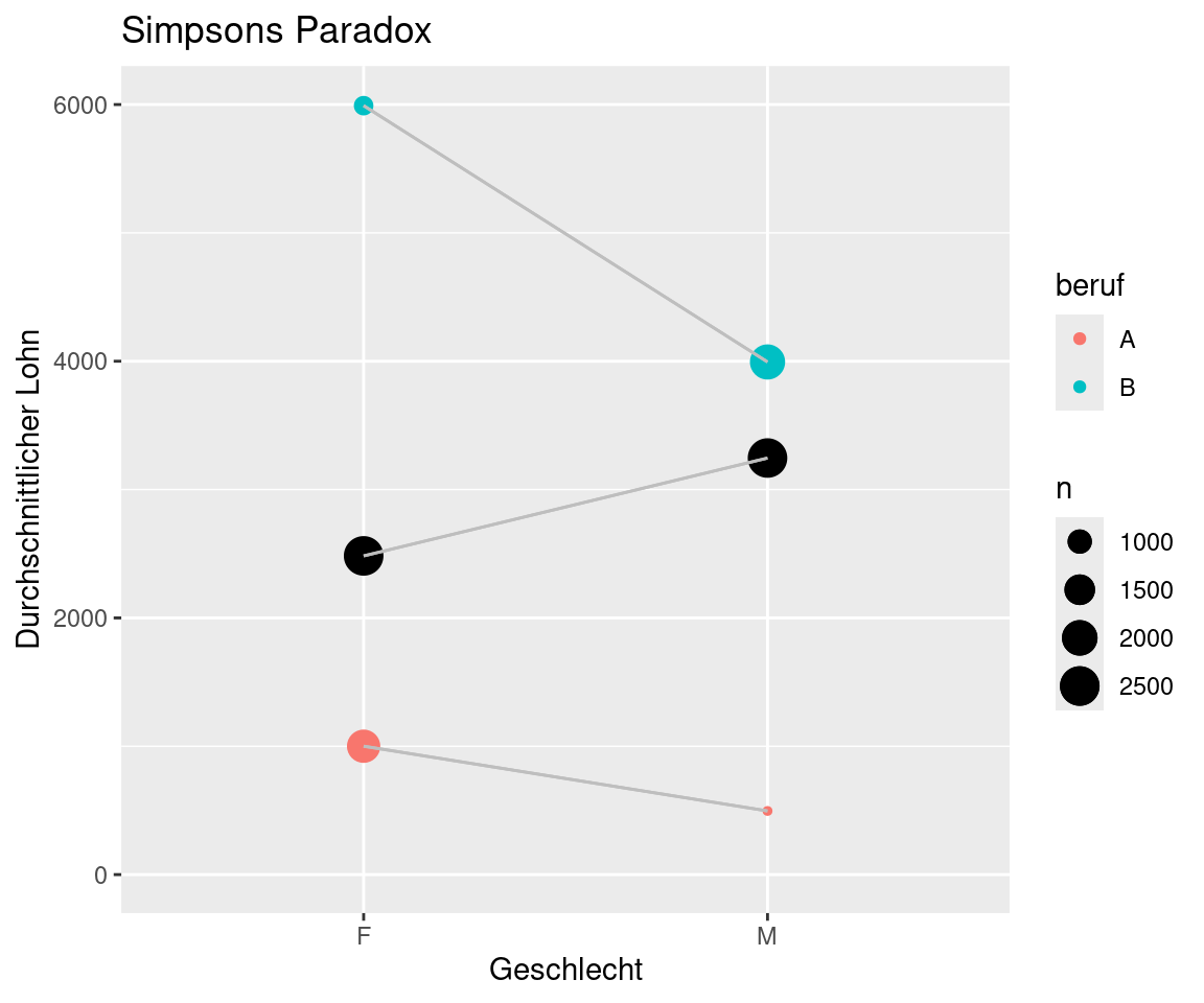 Wie man sieht, verdienen Frauen sowohl in Beruf A als auch in Beruf B im Durchschnitt deutlich mehr als die Männer. Obwohl die Frauen in beiden Berufen durchschnittlich mehr als die Männer verdienen, verdienen die Frauen in der Gesamtpopulation weniger als die Männer. Dies ist ein Beispiel für Simpsons Paradox.