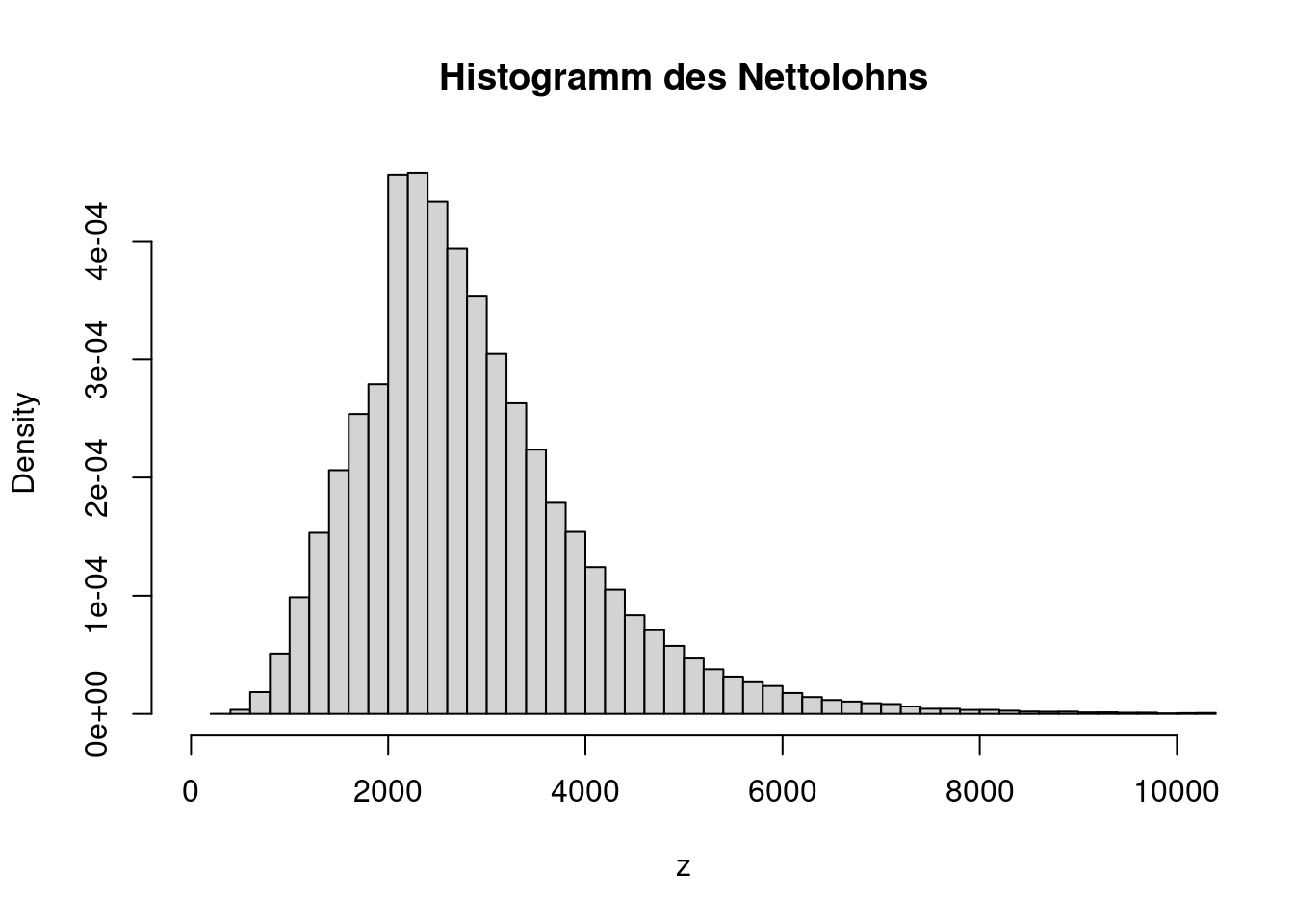 Die Dichte des Nettolohns kann durch das Histogramm approximiert werden. Diese Form der Dichte entspricht keiner bekannten Standardverteilung.