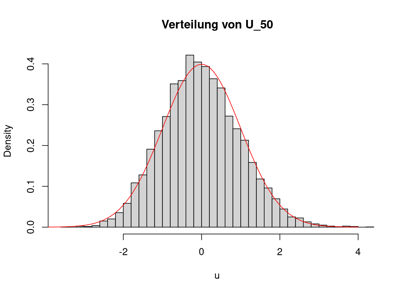 Das Histogramm der \(R=10000\) Zufallszahlen \(U_{n,1},\ldots,U_{n,R}\) kann trotz des noch kleinen Umfang \(n=50\) schon recht gut durch eine Standardnormalverteilung approximiert werden.