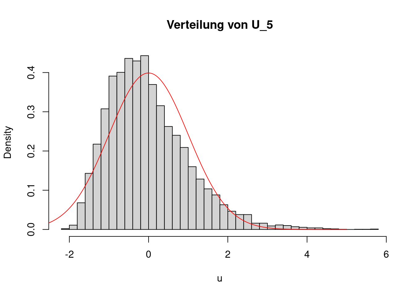 }Zur Erklärung: Der Laufindex der Schleife r durchläuft alle Werte von 1 bis R. Bei jedem Durchlauf wird zuerst die Folge x vom Umfang n aus der Exponentialverteilung gezogen. Anschließend wird der Durchschnitt der Elemente der Folge gebildet und unter dem Namen xquer abgespeichert. In der letzten Zeile der Schleife wird der Durchschnitt standardisiert und an die r-te Stelle des Vektors u geschrieben.