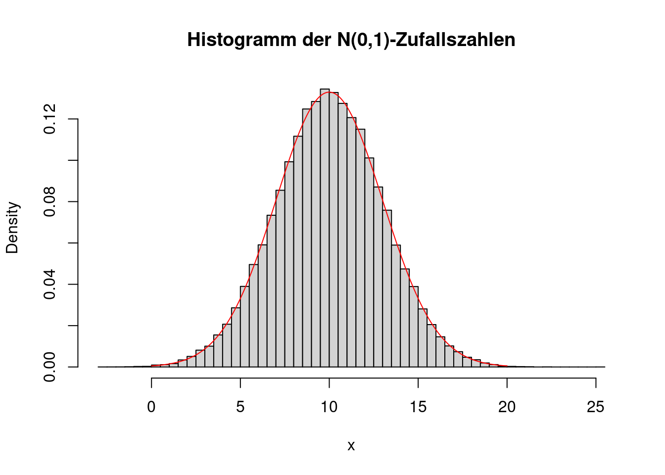 Der folgende Plot zeigt das Histogramm der Zufallszahlen zusammen mit der theoretischen Dichtefunktion der Normalverteilung, die als rote Linie ergänzt ist.