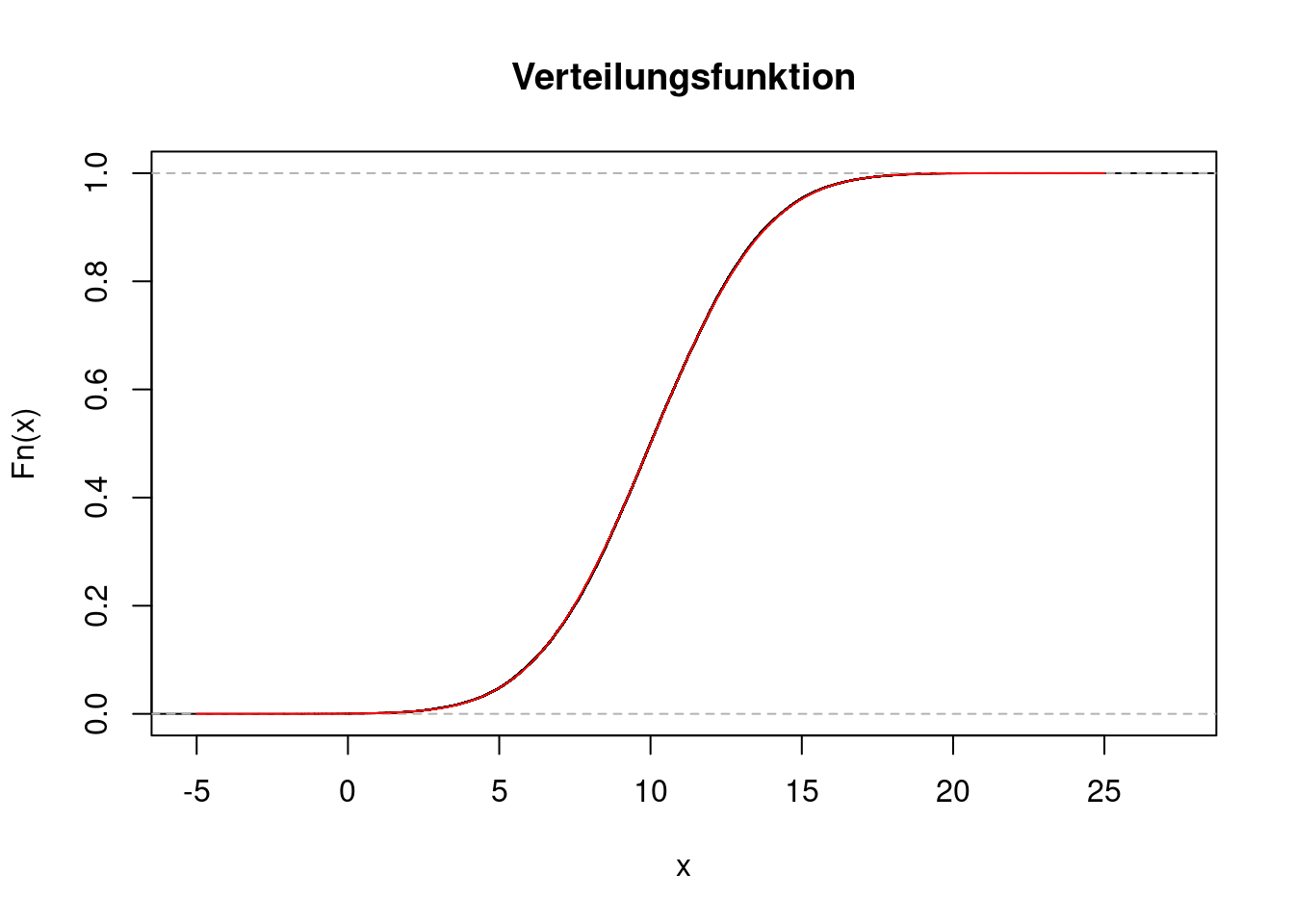 Im folgenden Plot sieht man die empirische Verteilungsfunktion der Ziehungen \(X_1,\ldots,X_n\). Die R-Funktion dafür lautet ecdf. Es handelt sich zwar um eine Treppenfunktion, aber die Stufen sind so klein (nämlich jeweils \(1/n=0.00001\)), dass sie nicht zu erkennen sind. Mit Hilfe der Funktion lines wird die theoretische Verteilungsfunktion der Normalverteilung als rote Linie ergänzt.