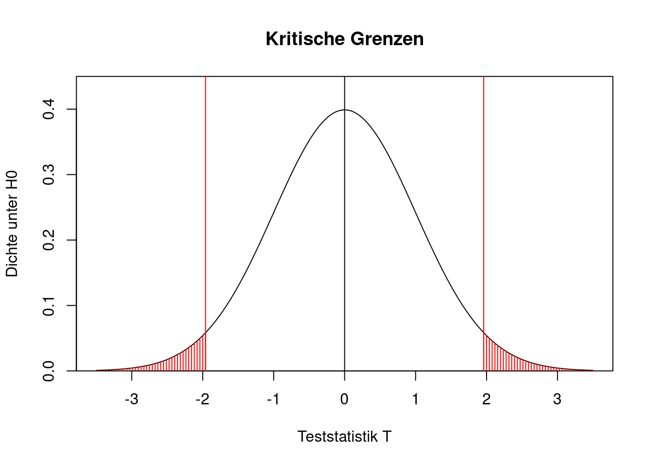Der kritische Bereich ist also \[ K=(-\infty,-u_{1-\alpha/2}]\cup [u_{1-\alpha/2},\infty). \] Mit anderen Worten: Wenn die Nullhypothese gilt, dann ist es nicht weiter verwunderlich, wenn die Teststatistik in dem Intervall \([-1.96,1.96]\) liegt. Wenn die Teststatistik dagegen aus diesem Intervall herausfällt, dann spricht das (auf einem Signifikanzniveau von 5 Prozent) gegen die Gültigkeit der Nullhypothese. In diesem Fall verwirft man \(H_0\).