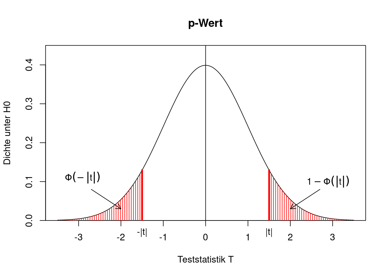 \[\begin{align*} \text{p-Wert}&=P(T < -|t| \text{ oder }T > |t|)\\ &= P(T< -|t|)+P(T>|t|)\\ &= P(T< -|t|)+1-P(T\le |t|)\\ &= \Phi(-|t|)+1-\Phi(|t|)\\ &= 1-\Phi(|t|)+1-\Phi(|t|)\\ &= 2(1-\Phi(|t|)). \end{align*}\]