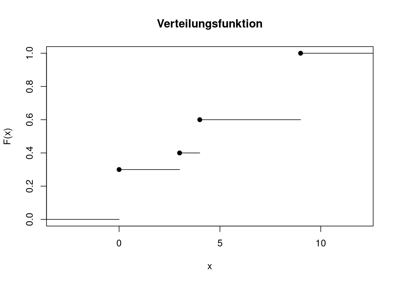 Die folgende Abbildung zeigt die Verteilungsfunktion einer Zufallsvariablen \(X\). Hier und bei den folgenden Abbildungen im Rest dieses eLehrbuchs können Sie den R-Code, mit dem die Grafiken erzeugt werden, aufklappen. Er wird jedoch nicht näher erklärt und ist zum Verständnis des Inhalts auch nicht notwendig.