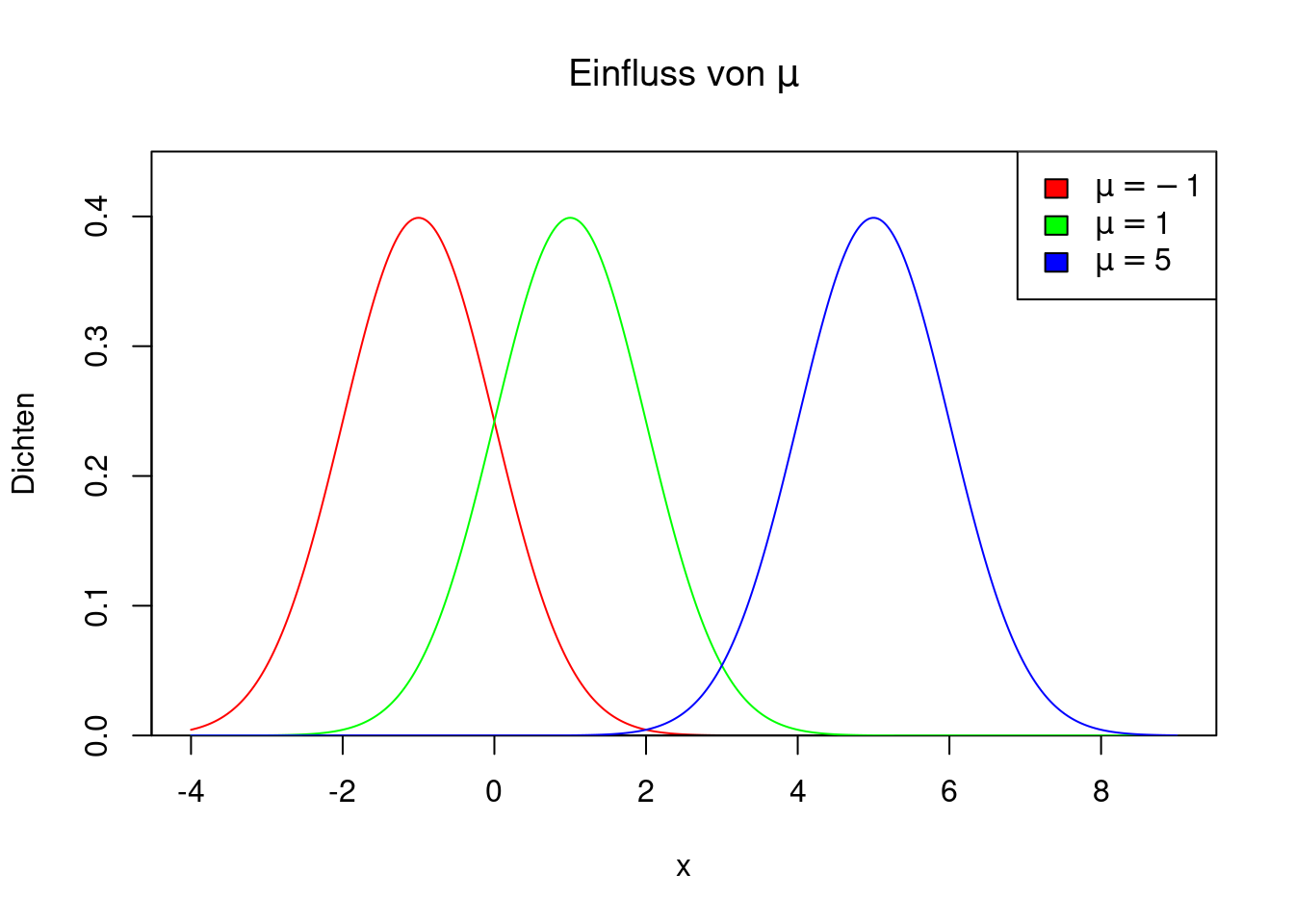 Der Parameter \(\mu\) bewirkt eine Verschiebung der Dichte. Für positive Werte von \(\mu\) liegt die Dichte weiter rechts, für negative Werte weiter links. Wenn \(\mu=0\) ist, weist die Dichte eine Symmetrie um die 0 herum auf. Die Abbildung zeigt drei Dichten von \(N(\mu,1)\) für \(\mu=-1,1,5\).