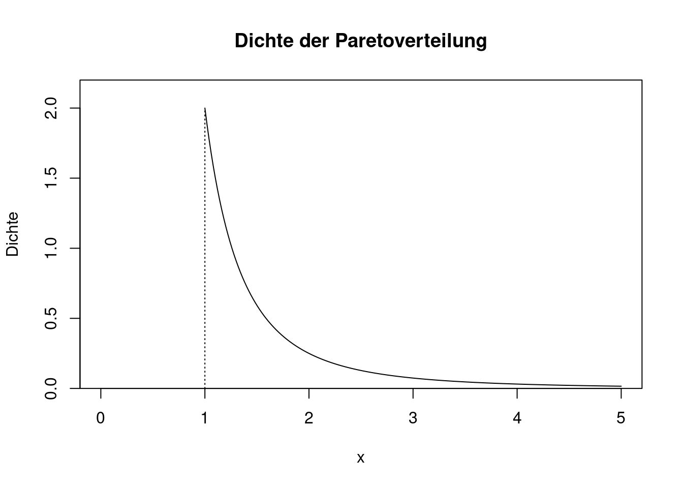 Die Paretoverteilung hat zwei Parameter, und zwar \(x_{min}>0\) und \(k>0\). Die Dichte lautet \[ f(x)=\left\{ \begin{array}{ll} 0 & \text{ wenn }x<x_{min}\\ \frac{k}{x_{min}}\left(\frac{x_{min}}{x}\right)^{k+1}& \text{ wenn }x\ge x_{min}. \end{array} \right. \] Für \(x_{min}=1\) und \(k=2\) ergibt sich folgendes Bild: