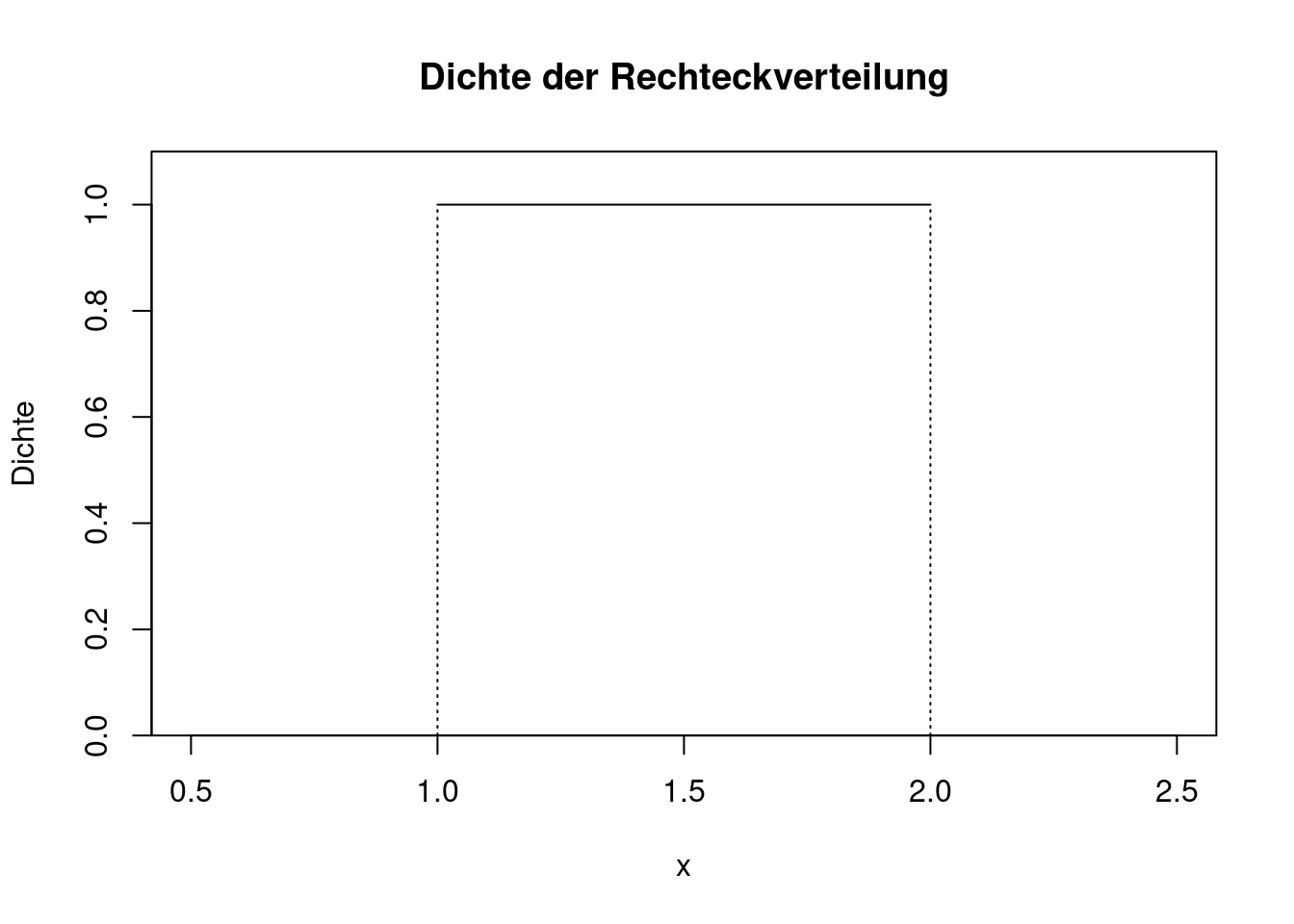 In R ist die Abkürzung für die Rechteckverteilung unif. Die Funktionen für die Dichte, Verteilungs- und Quantilfunktion sind: