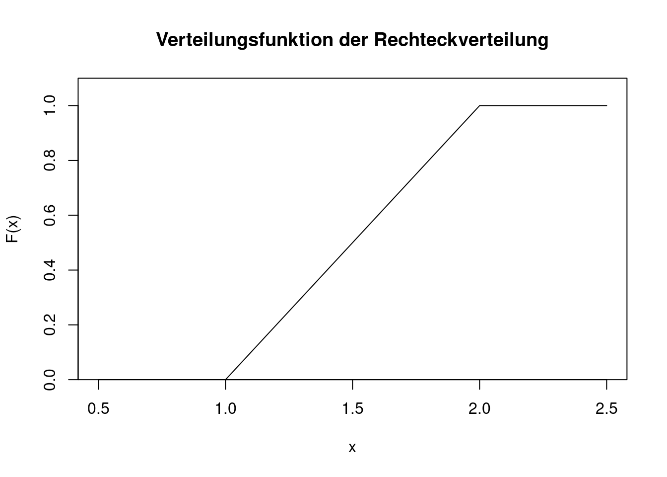 Die Verteilungsfunktion erhält man durch Integration der Dichte. Außerdem muss die Verteilungsfunktion an der Stelle \(a\) den Wert 0 annehmen. Für die Verteilungsfunktion ergibt sich \[ F(x)=\left\{ \begin{array}{ll} 0 & \text{ wenn }x<a\\ \frac{x-a}{b-a}& \text{ wenn }a\le x\le b\\ 1 & \text{ wenn }x>b.\\ \end{array} \right. \] Die Verteilungsfunktion von \(U(1,2)\) sieht wie folgt aus.